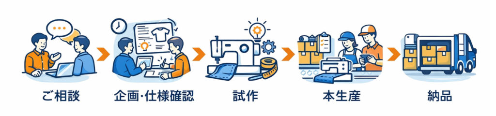 企画・試作・量産・納品まで、専任スタッフが一貫してサポートします。