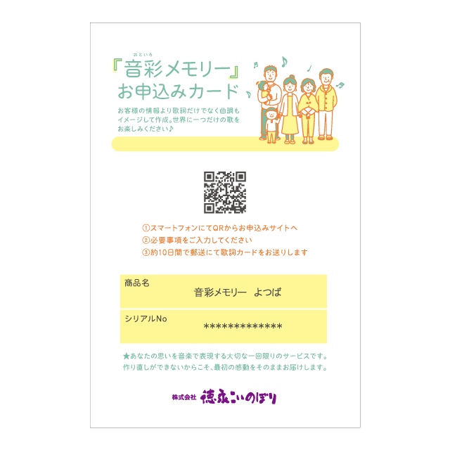 お申し込みフォームに「シリアルNo」と「お子様の情報」を入力するだけで《AI》 《プロの手》で完全オリジナルのソングを制作。お子様のお節句記念に、心あたたまる音彩メモリーをお届け。